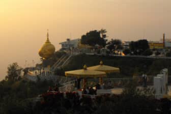 Placé en haut du Mont Kyaiktiyo, le rocher est comme suspendu au bord de la falaise : c’est un cheveu de bouddha qui, dit-on, le maintiendrait dans cet improbable équilibre.