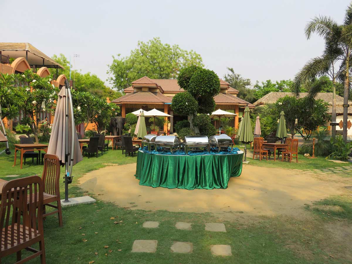 Bien que cette rue à l’extrémité de New Bagan manque d’attrait, Bawga Theiddi représente son opposé en dissimulant un espace naturel, moderne et chaleureux, avec de nombreuses prestations et qualités pour vous le prouver.Le parc, est le point central de l’établissement. Verdoyant et embellit par quelques arbres, jardins et statuts, on trouve également le buffet d’extérieur entourer de tables, ainsi qu’une imposante piscine et son jacuzzi, légèrement à l’écart. Un deuxième restaurant est situé à proximité directe, ainsi qu’un « sky lounge » (terrasse sur le toit) avec bar, barbecue, snack et bien entendu, une vue somptueuse sur le levé et couché du soleil.Coté chambres, trois classes vous sont proposées. A savoir, les supérieurs, deluxes et les villas. La catégorie supérieure est équipée de la climatisation, balcon ou terrasse, mini bar, bureau, télévision, coffre fort, réfrigérateur, douche avec eau chaude, sèche cheveux, peignoirs, cafetière/théière et bouteilles d’eau offertes. La classe deluxe, équipée à l’identique est légèrement plus spacieuse et d’un style encore plus esthétique, tandis que les villas sont bien plus spacieuses et intègrent une baignoire.Pour conclure, un spa avec massages, un centre de fitness, un terrain de golf, l’accès wifi, une zone fumeur, un centre d’affaire et salle de réunion, une blanchisserie, des boutiques et locations de vélos seront à votre entière disposition pour agrémenter ce séjour ravissant.