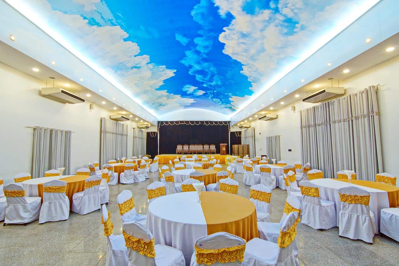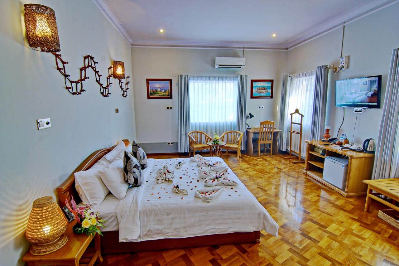 Ce moderne établissement aux nombreux services et équipements, est situé à l’est du Palais royal, à dix minutes en voiture du centre ville ou de Mandallay Hill.Sa configuration mimant une rue privée avec ces maisons aux murs clairs et toit en tuile, offre une atmosphère paisible et agréable, protégée de l’agitation de Mandalay. Ces petites maisons sont donc misent à votre disposition, contenant individuellement une villa de classe deluxe ou suite junior. Spacieuses, silencieuses et confortables, elles sont équipées de climatisation, télévision, coin salon, mini bar, cafetière-théière, coffre fort, baignoire, sèche cheveux, produits de toilettes, peignoirs serviettes et mobiliers en bois.Cet établissement inclut également une large piscine et son bar, spa, salle de fitness, salle de restaurant et bar, vaste salle de meeting, de buffet et ou spectacles (avec son plafond peint), zone fumeur, salon détente et terrain de golf. Les services tous aussi nombreux, avec blanchisserie, réception 24/24, connexion wifi, distributeur de billet et change de devises, stockage bagages, garde d’enfants, locations de vélo, service voiturier…Un projet d’expansion afin de vous offrir de nouvelles catégories et chambres est en cour.