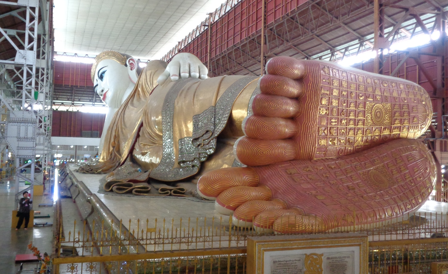 Allongé sur tout le long de ces 65m, ce prestigieux buddha incliné a été entièrement financé par les donations faramineuses des habitants. Installé en 1907 dans ce grand bâtiment métallique, il fut restauré dans les années soixante, adoptant cette posture définitive.A découvrir de la tête aux pieds, pour ne manquer ni sa couronne ornée de pierres précieuses, ni ses plantes de pieds tatouées des lakshanas, 108 marques sacrées qui le différencient des mortels.